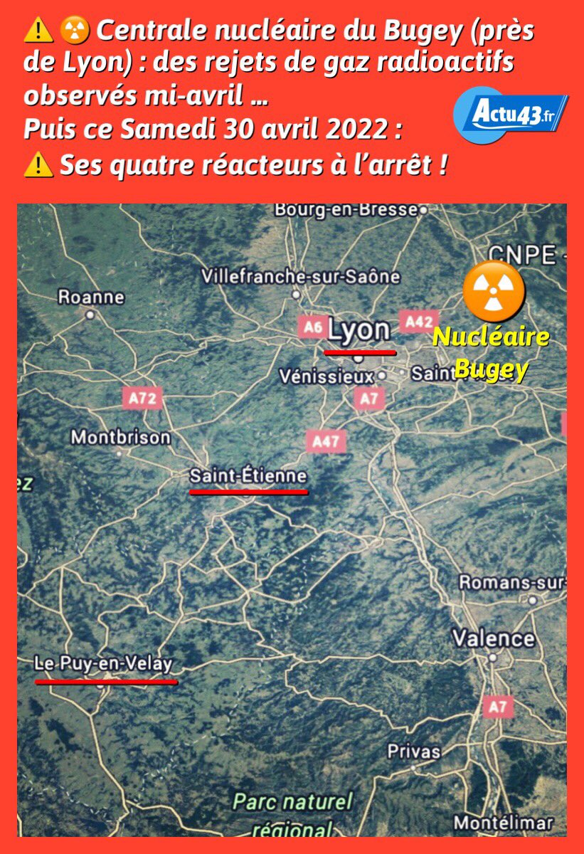 Pendant ce temps, nous apprenons que des rejets gazeux radioactifs ont eu lieu à la centrale électrique du Bugey (25 km à l'Est de lyon). Les 4 réacteurs sont placés à l'arrêt. Ils représentent 40 % des besoins en électricité de la région.