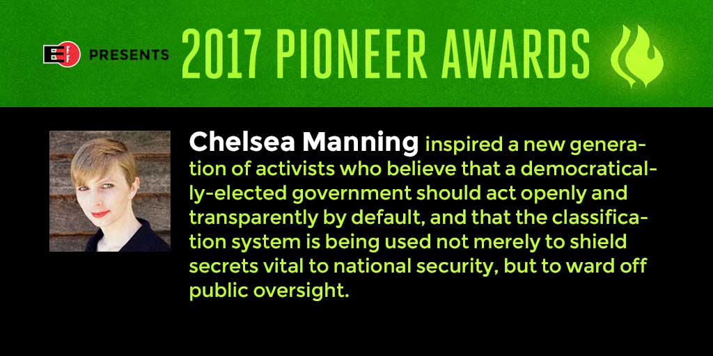 Congrats on winning EFF's 2017 Pioneer Award, Chelsea!pic.twitter.com/Oi3fuI5nNJ