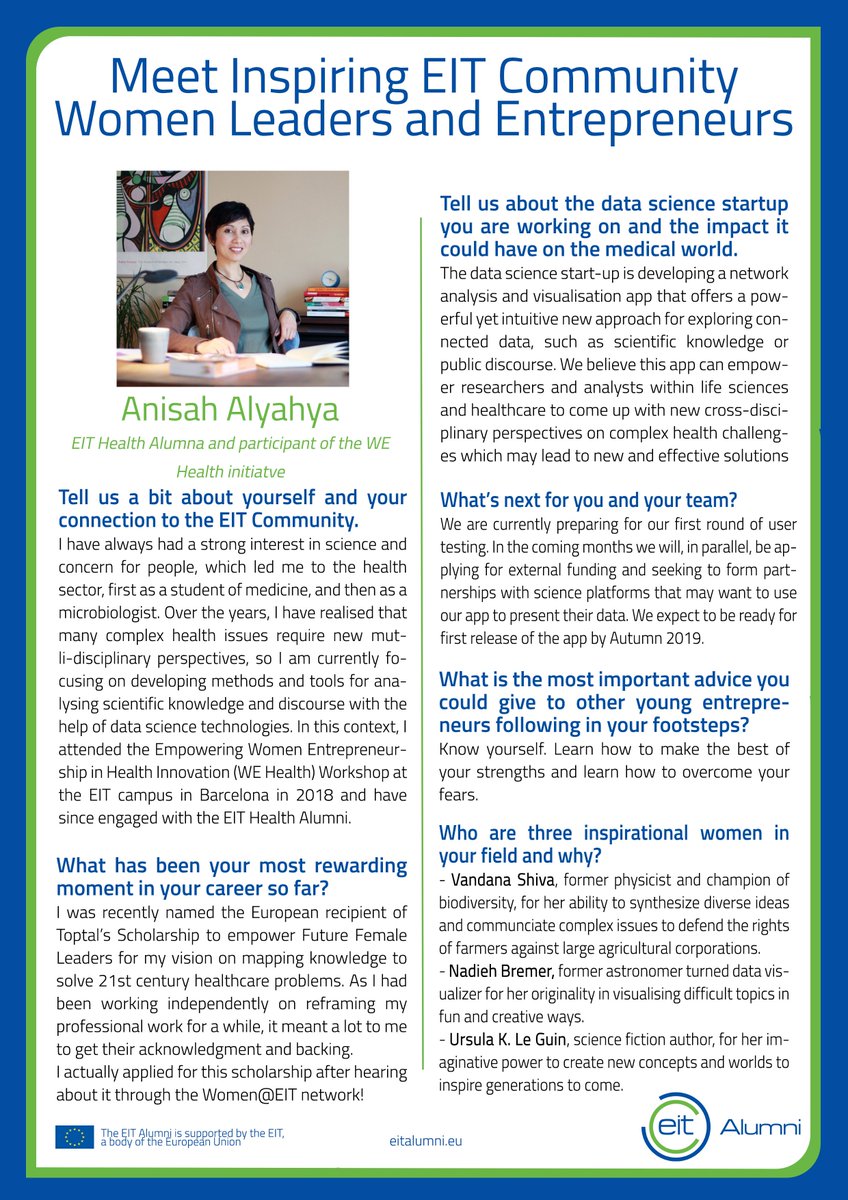 Anisah is an @EITHealthAlumni of the@WEHealthEIT She was awarded the@toptal scholarship for female leaders in Europe! Read her full interview here: http://bit.ly/2HLAo5Kn pic.twitter.com/LOyfUpRsAV
