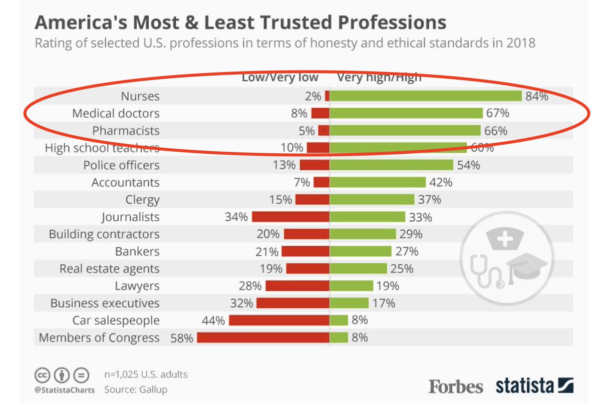 @VPrasadMDMPH Who says the medical profession has a trust problem? We’re the most trusted profession in America. Seriously. Do you have evidence? https://www.forbes.com/sites/niallmccarthy/2019/01/11/americas-most-least-trusted-professions-infographic/#118e9abe7e94 …pic.twitter.com/F3CpzpjWDA