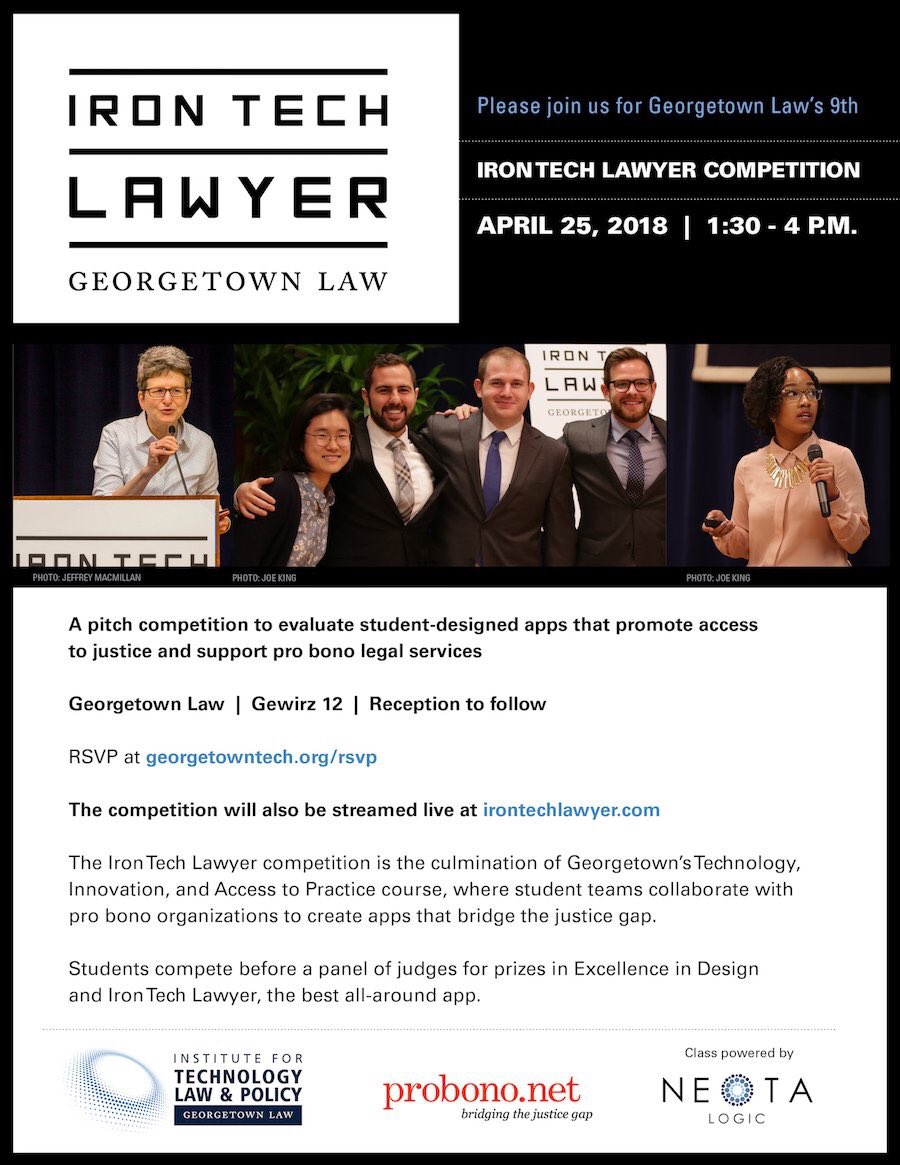 @GtownTechLaw for the 9th Annual Iron Tech Lawyer Competition on April 25th. RSVP for live stream at http://irontechlawyer.com pic.twitter.com/iR6kOf3LNU
