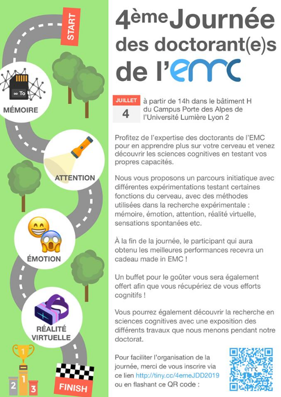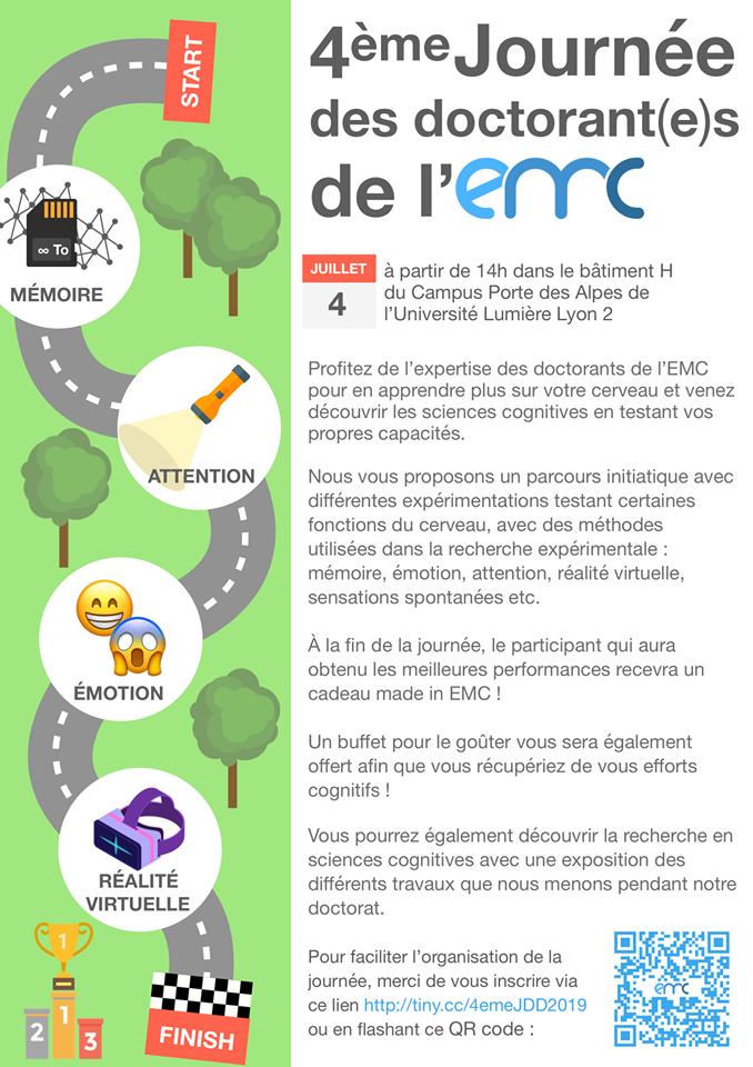 @EMCLaboratory de l'@univ_lyon2 le 4 juillet !#cognition#EMC@UniversiteLyon inscriptions : http://tiny.cc/4emeJDD2019 pic.twitter.com/kWiZ70rzXP