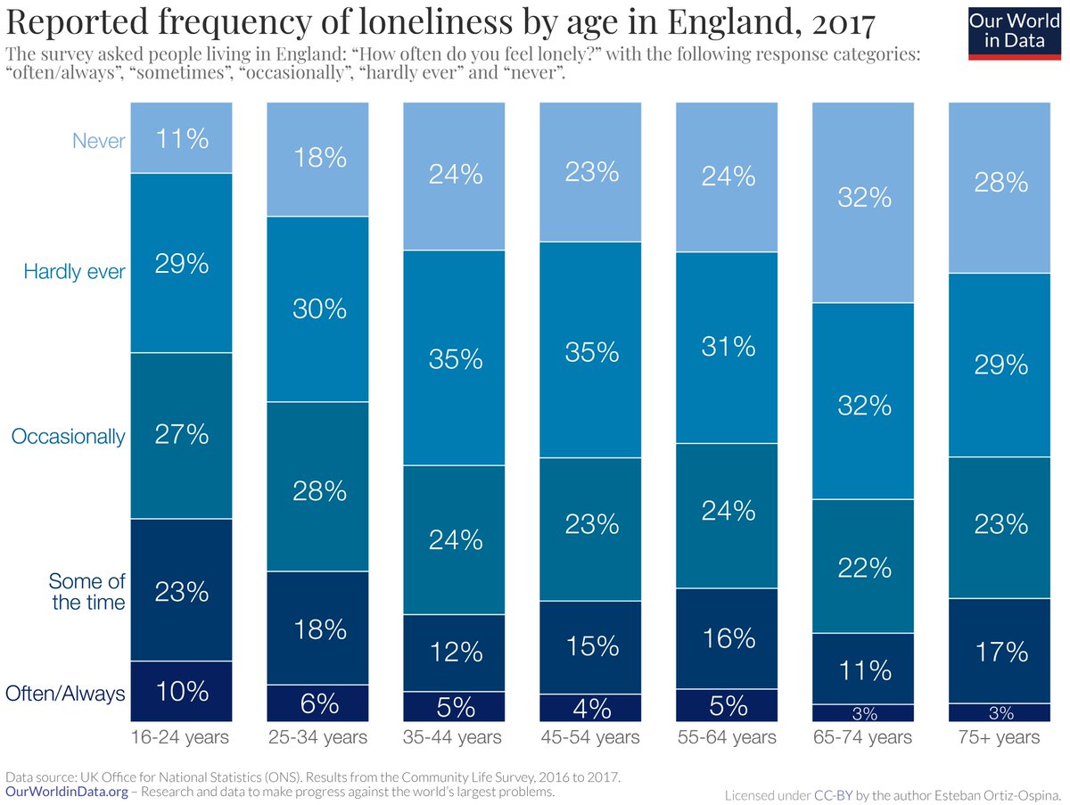 Loneliness is often higher for teenagers than older adults People often find this surprising and assume it must be a sign of increasing loneliness over time (the 'loneliness epidemic' spreading among teens) In this post I show this assumption is wrong: https://ourworldindata.org/loneliness-epidemic …pic.twitter.com/EsavsGvAKE