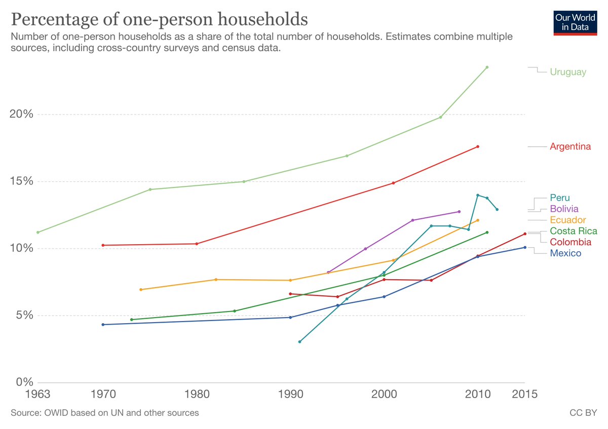 La proporción de personas viviendo solas, ha aumentado en casi todos los países del mundo. La tendencia en América Latina es pronunciada: En Perú, la proporción creció de 3% a 13% en una década. Más información, discusión y datos en este artículo: https://ourworldindata.org/living-alone pic.twitter.com/wPicAfrU87