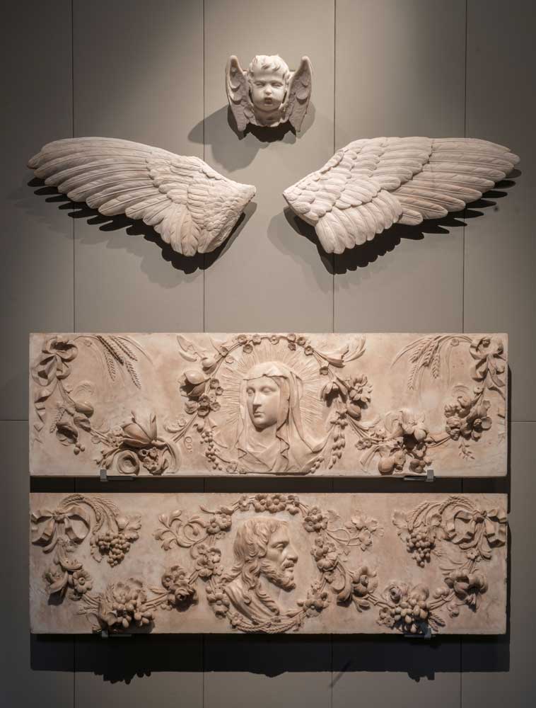 These panels, angel wings and cherub head were part of the altarpiece designed by Sir Christopher Wren for James II. Queen Anne later gave them to the Abbey. Now you can see them in The Queen's Diamond Jubilee Galleries.