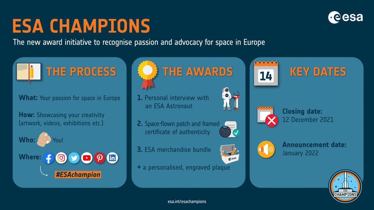 #space in Europe and want to share it with others? Join the@esa Champions initiative, rewarding passion and advocacy for Space in Europe with unique prizes. Read about#ESAChampions at http://esa.int/esachampions and join by 12 December.pic.twitter.com/hRnw6vR4Qc