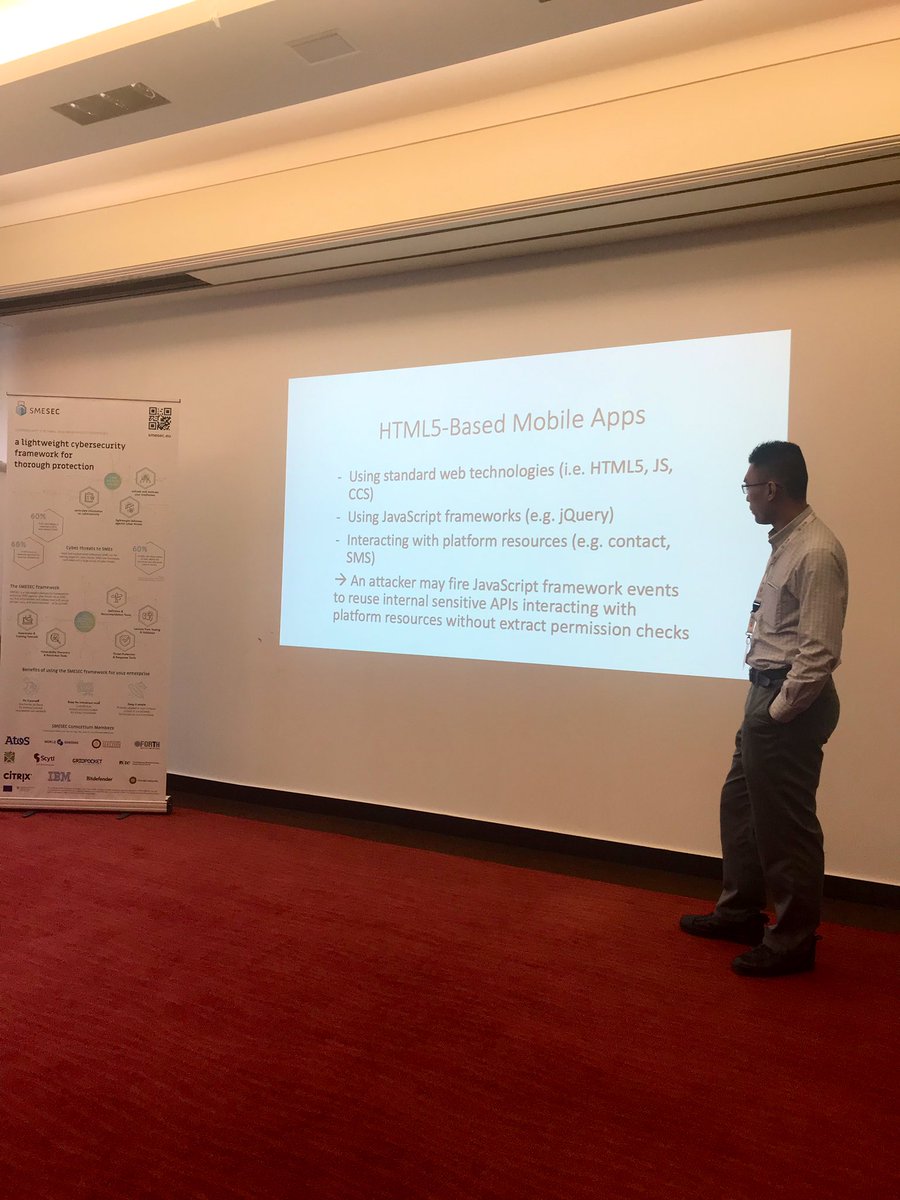 @SMESEC_EU workshop#IOSec2019 in@esorics2019, starts with the presentation on “Event-based Remote Attacks in HTML5-based Mobile Apps” by Tuong Lau.pic.twitter.com/f6EStSrh4F