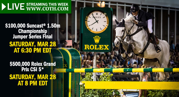 We're LIVE! Watch the @SuncastCorp 1.50m Finale and the $50k Rolex CSI5* GP. Starts @ 6:30p: http://bit.ly/1MaVwBa .pic.twitter.com/w1dH6jDcEz