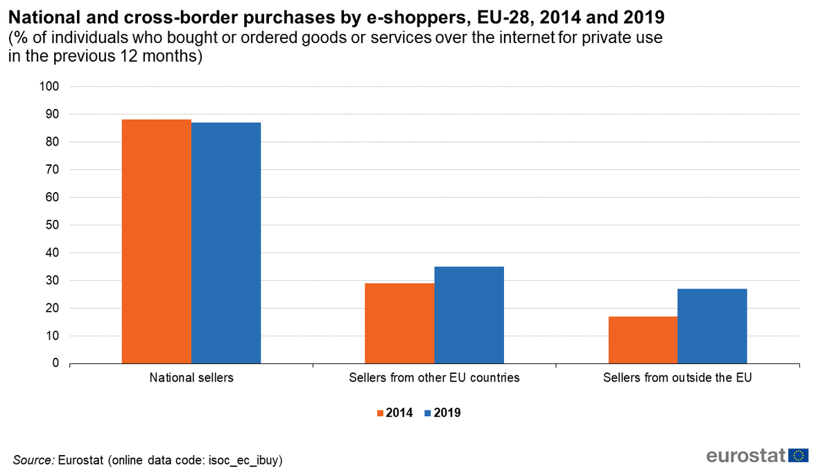 In 2019, 35% of e-buyers made purchases from sellers in other EU countries, compared with 29% in 2014