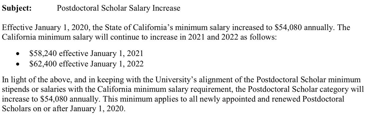 Big increases in minimum postdoctoral salaries for California. $54,080 - Jan 1st 2020 $58,240 - Jan 1st 2021 $62,400 - Jan 1st 2022 + fringe benefits on top (22.5% @ USC) Much higher than $50k for years 0-2 of NIH/NRSA fellowships. NINDS R01 modular budget is $218k / yr.
