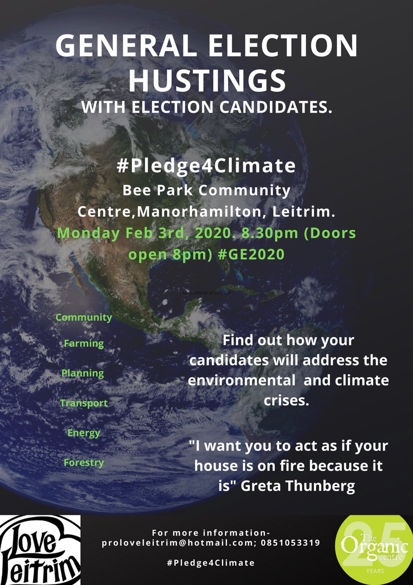 #GE20 Election Hustings Mon Feb 3rd 8.30pm Bee Park Manorhamilton#Leitrim.Come&here your candidates plans for tackling the#ClimateEmergency and other issues like#Transport#Energy#Farming#Forestry Please RT and spread the word.#Sligo#Leitrim#Donegal#Roscommonpic.twitter.com/l5YP7sUAqO
