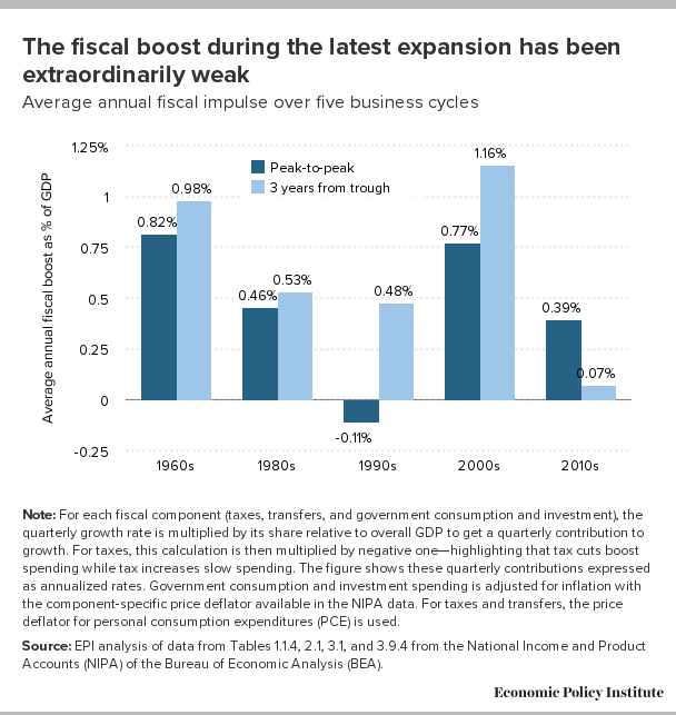"A key lesson from the Great Recession is that fiscal policy is the most effective tool for aiding recovery. Monetary policy can lay the groundwork for fiscal policy, but really cannot be relied on to play more than a supporting role for fighting recessions.