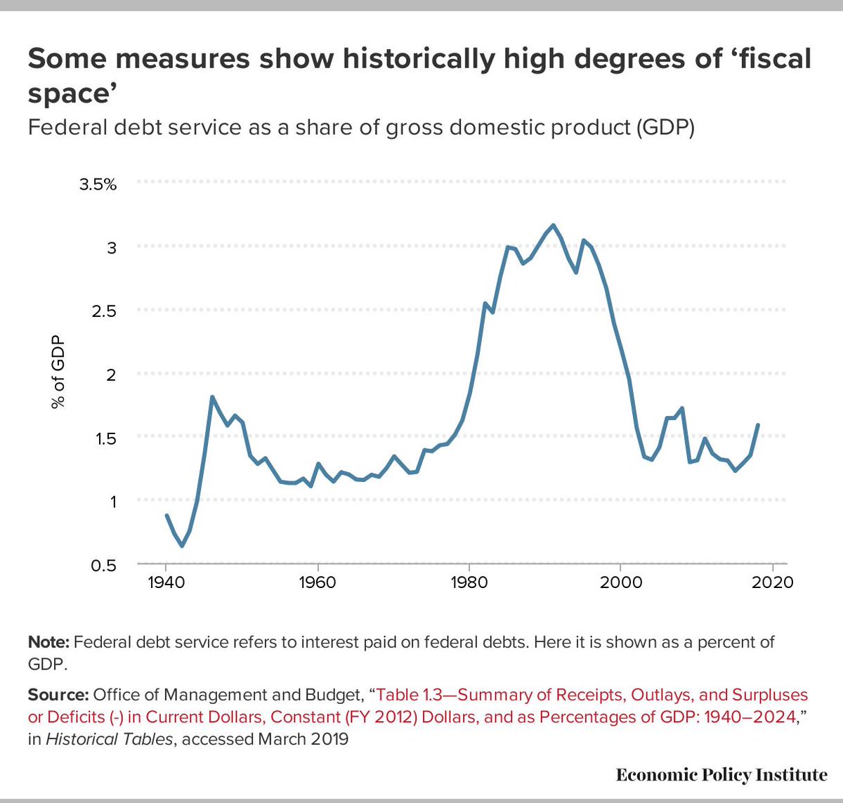 "The evidence presented to justify claims of little fiscal space is usually just the federal debt as a proportion of GDP. This ratio in 2018 (77.8 percent) sat a bit over twice as high as it was before the Great Recession.