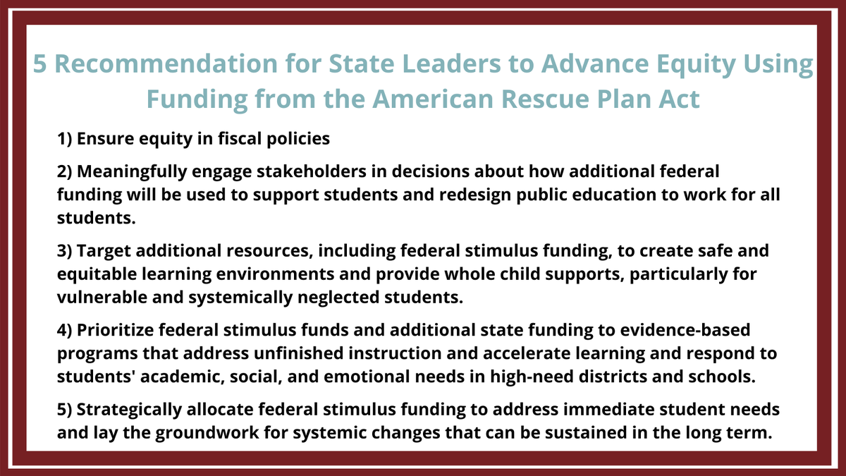 #COVID19 crisis has disrupted education for all students but has impacted students from systemically neglected communities hardest. As states receive billions of dollars from the#AmericanRescuePlan here are 5 recommendations to advance equity https://edtru.st/3u1aTnf pic.twitter.com/9AjcY1TywI