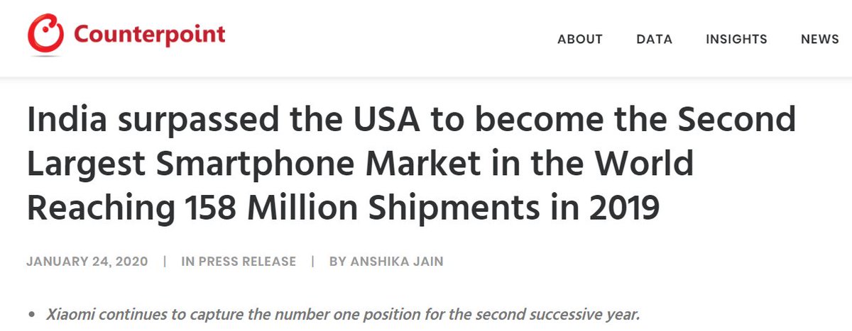 -@CounterPointTR Read here: http://www.counterpointresearch.com/india-surpassed-usa-become-second-largest-smartphone-market-world-reaching-158-million-shipments-2019/ … Proud of playing a small role in this. Am sure India will soon be an economic super power!#Xiaomi
