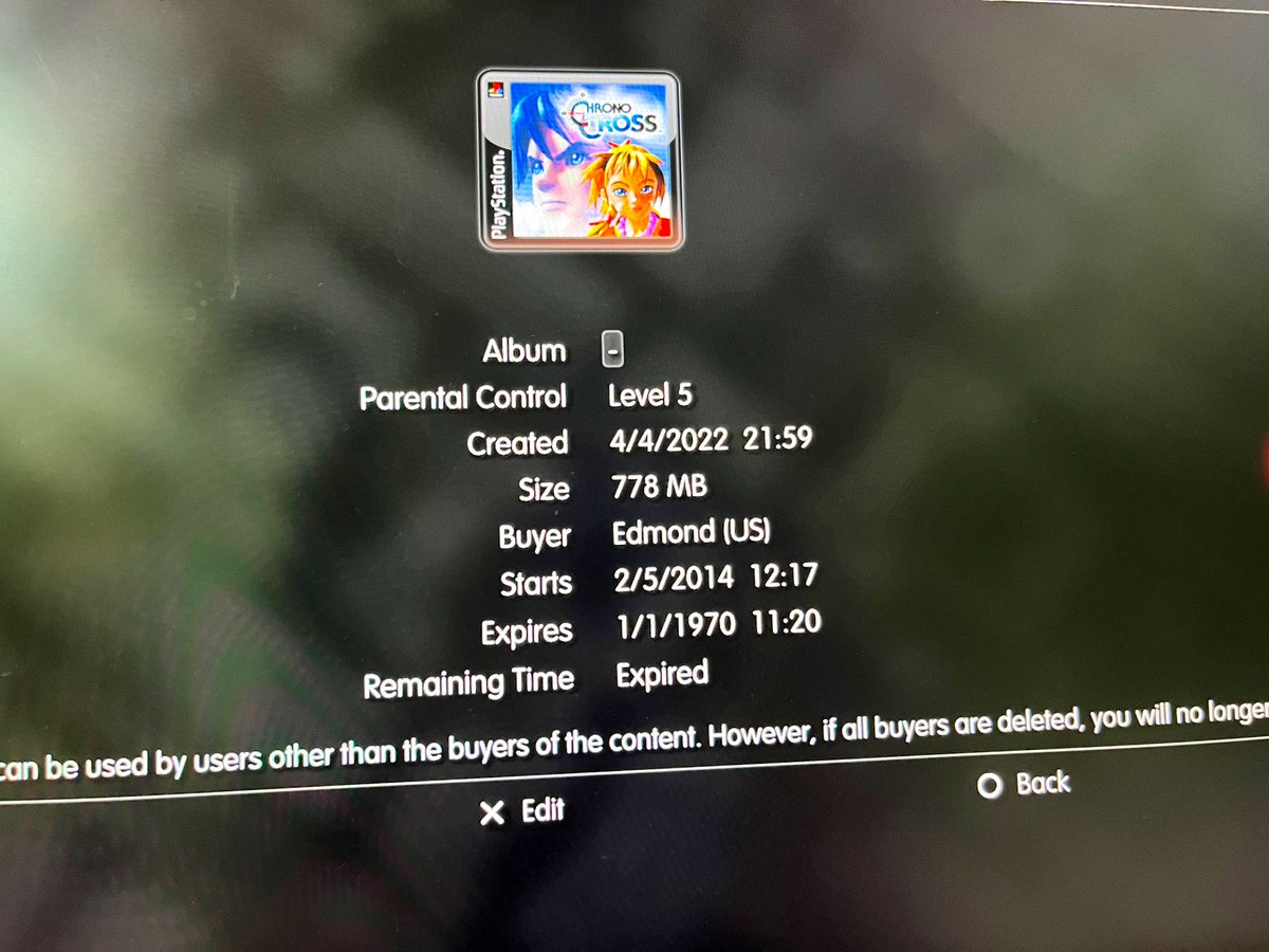 Here’s something shitty: - The PSOne Classics version of Chrono Cross can’t be found on the PS Vita store anymore, only on your download list if you bought before. Runs fine though. - It’s on the PS3 store, but trying to install and run it tells me it expired? In 1970?? wtfpic.twitter.com/o0xz96izmF