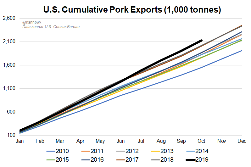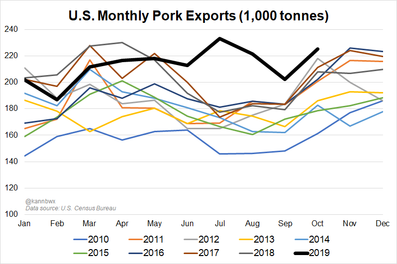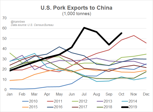 #pork in October, record high for the month and the 5th consecutive record monthly high. YTD (Jan-Oct) shipments total 2.13 mmt, 5% above last year's record. Some 18% of 2019 shipments have gone to#China.pic.twitter.com/YocdQwShqJ