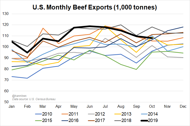 #beef in October, bringing the YTD total to 1.1 mmt, down 3% from last year's record. Top destinations were Japan (20%), Mexico (19%), and South Korea (18%).pic.twitter.com/LUufVECLkf