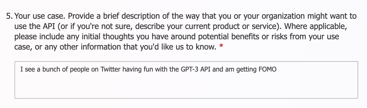Everyone's having too much fun with GPT-3, just signed up for the beta! @OpenAI pls send invitespic.twitter.com/XUAciZpJ4t