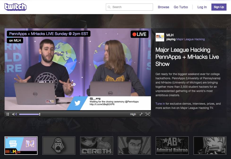 .@PennApps and @MHacks on the frontpage of @Twitch. Thanks @MLHacks for making it possible!pic.twitter.com/kVRODvsVM3