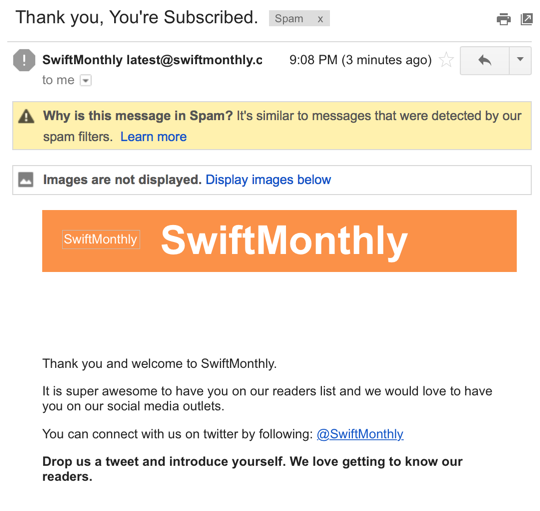 @SwiftMonthly hey! really excited about Swift Monthly. However just FYI your email confirmation went into my spam on gmail.