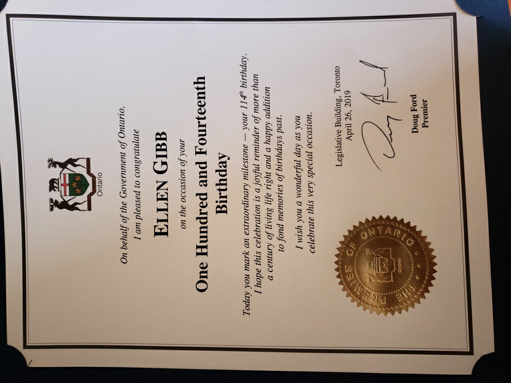 Pleased to join Ellen (Dolly) Gibb as she celebrates he 114th birthday, in North Bay. That's no typo ... Dolly is the oldest person in North America ... and 9th oldest in the world. Presented her with celebratory scrolls from Premier Doug
