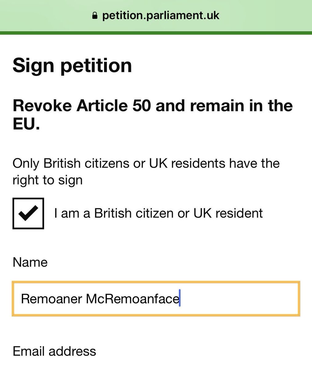 Oh, this is going to be a fun afternoon. You can sign any name you want to the Revoke Article 50 petition and use the same email address repeatedly. Let the games begin! #RemoanerMcRemoanfacepic.twitter.com/WMWKExiBUy