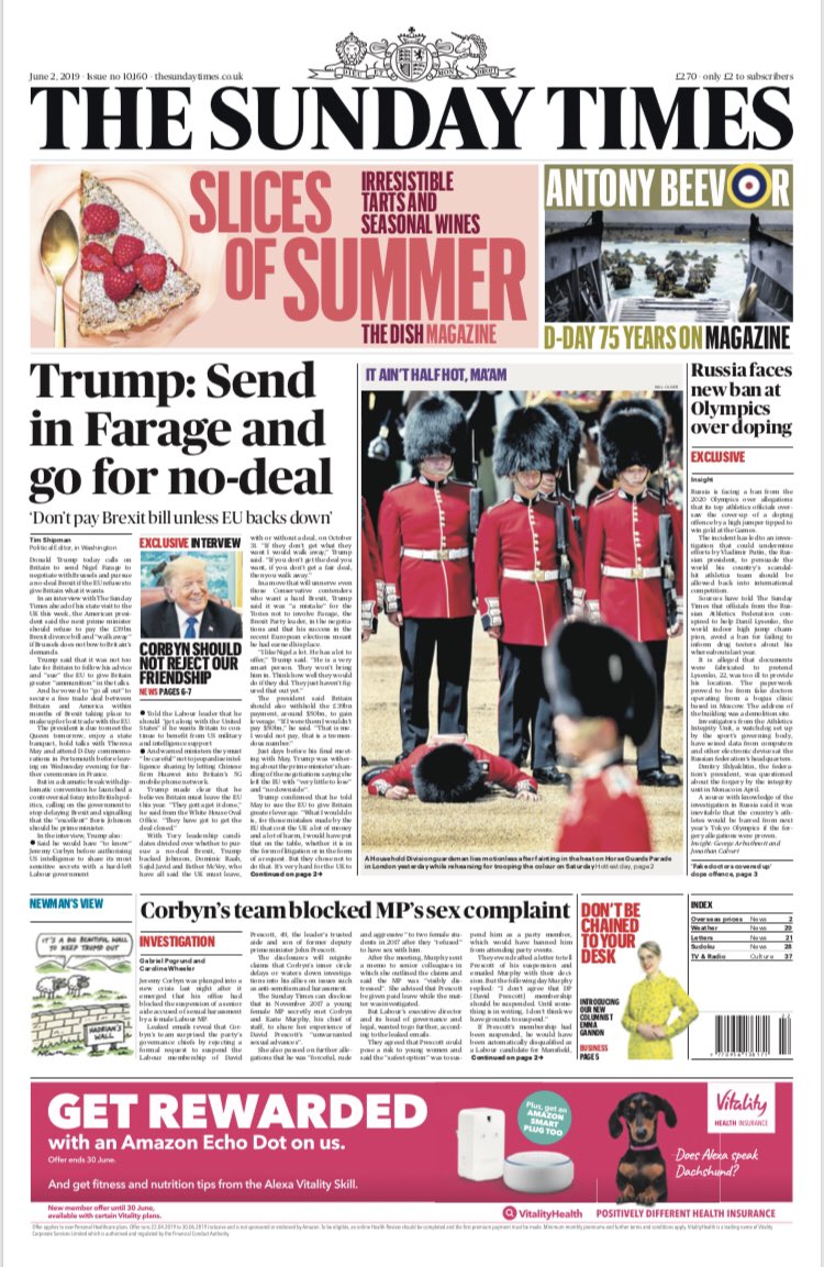 BREAKING: Donald Trump tells The Sunday Times that the government should send Nigel Farage to negotiate Brexit, refuse to pay the £39bn and go for no deal if they don’t budgepic.twitter.com/dHuo3zokJn