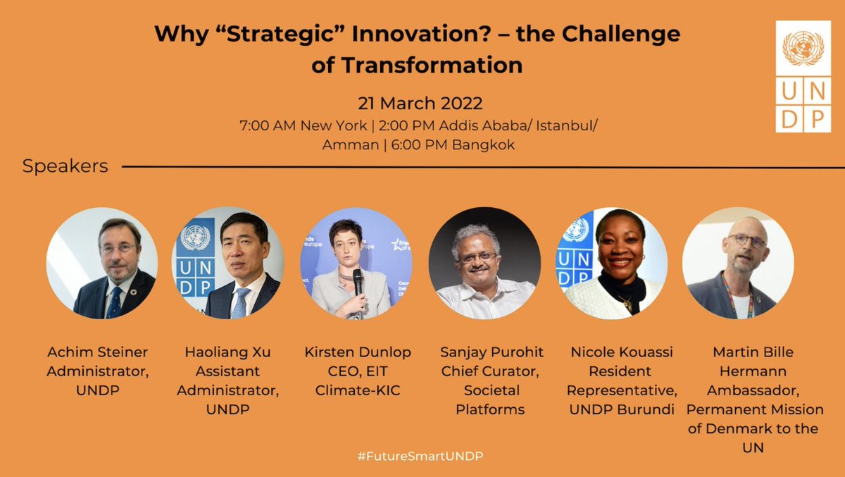 @ClimateKIC,@SanjayPurohitM,@KouassiNicole,@BilleHermann,@HaoliangXu & I to discuss advancing the shift towards “strategic” innovation through the lens of@UNDP's new Strategic Plan 2022-2025.