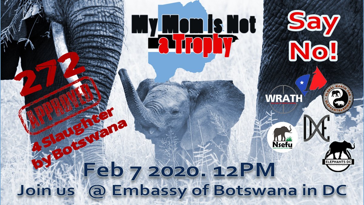 #SayNO. 272 elephants approved for slaughter in Botswana, one already sold in Canada. The earth does not belong to us. We belong to the earth. Her children are NOT ours to sell for slaughter. Feb 7 2020. 12pm @ Botswana Embassy in DC. Join us! https://www.facebook.com/events/2292550204378071/ … *SHARE*pic.twitter.com/qRd9mpoIB9