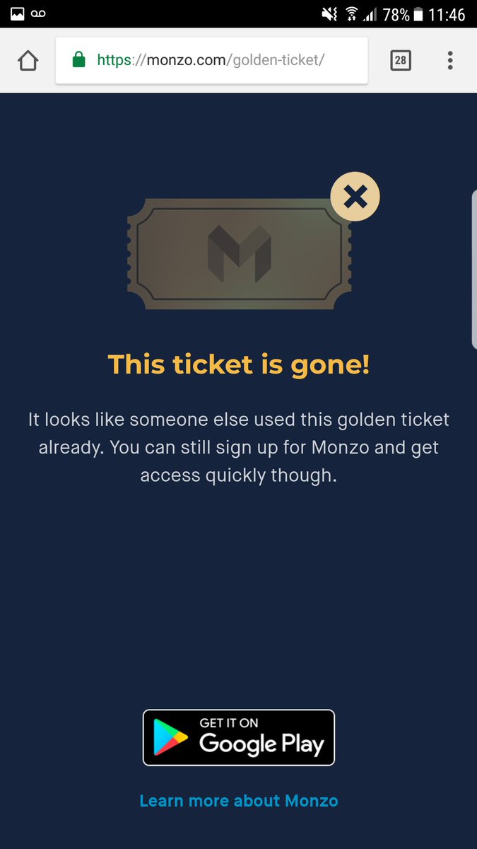 @monzo Hey Monzo! My app says I have a golden ticket, and yet my boyfriend tried to use it and it says it's gone :( I have only sent it to him so there's no chance it's been claimed, any ideas of what I can do?pic.twitter.com/6ssYKj7RE8