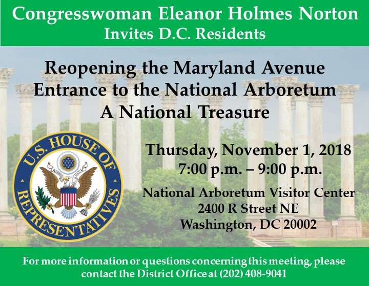 Join local leaders and me tomorrow for a community meeting at the National Arboretum to discuss the reopening of the Maryland Avenue gate to this natural wonder within DC. Opening the gate would increase access for DC residents, esp children and parents who want to enjoy nature!pic.twitter.com/JcNybccst1