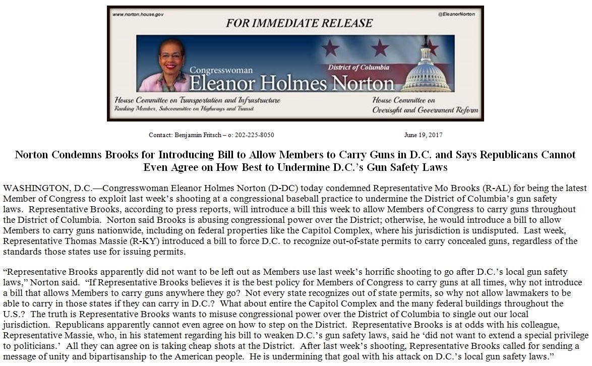 .@RepMoBrooks using last week's shooting to go after DC's gun safety laws. His bill would let Members carry guns throughout DC #HandsOffDCpic.twitter.com/9wmIjLZvnG