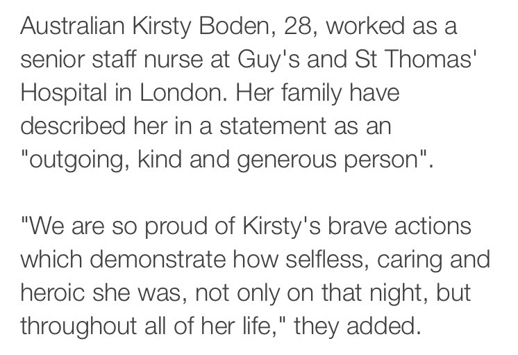 Australian Kirsty Boden named as killed in London Bridge attack. She was a nurse, and was killed when she went to the aid of another.