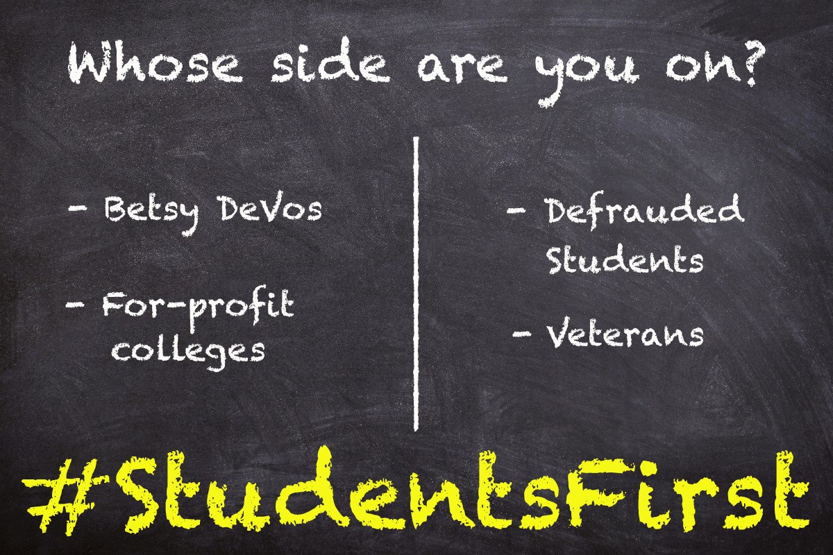 This afternoon, Senators will have a choice to make. Will we stand up for defrauded students & veterans? Or will we side with Betsy DeVos and #4profit colleges. Let’s do the right thing. Let’s put #StudentsFirst & overturn DeVos’ borrower defense rule.pic.twitter.com/46JuqiAxkg