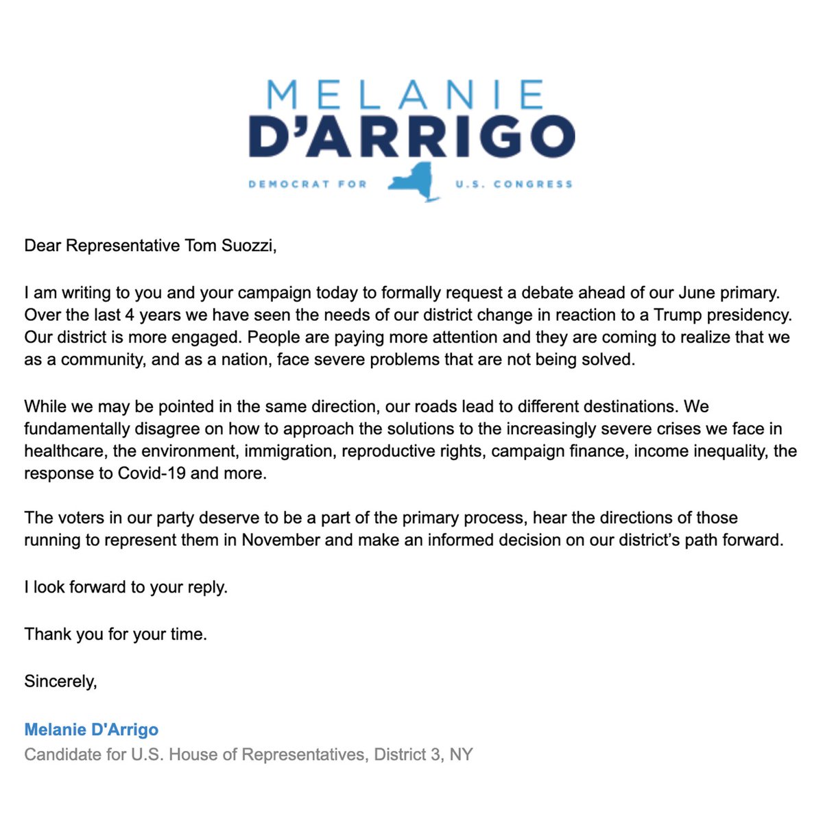 Today, I formally requested a debate with @RepTomSuozzi ahead of our June primary. The Democrats in our district deserve the right to make an informed decision in how our party moves forward. pic.twitter.com/gF4nI9B2AN