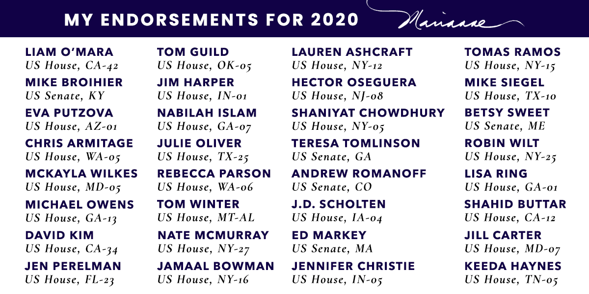 This is not a moment to be saying “Ain’t it awful.” It’s a moment to be saying “Ain’t it wonderful!” It’s wonderful that so many incredible people are running for Congress, taking on the old guard and standing for a new America. What they need is our help! https://secure.actblue.com/donate/marianneendorses …pic.twitter.com/Vov5gnjKty