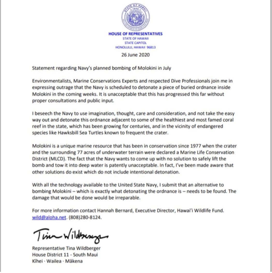 This decision by the Navy is unacceptable. We need to stand together and convince them to walk back on this planned bombing of Molikini