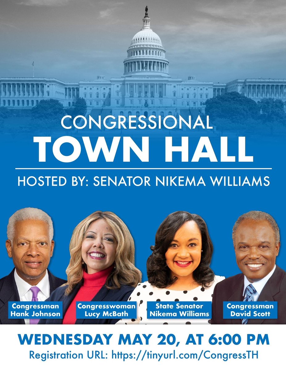 Join me Wednesday, May 20 at 6:00 pm for a virtual town hall on #COVID19. Along with @NikemaWilliams, @RepHankJohnson & @RepLucyMcBath, we'll share the latest public health information and discuss our work to bring federal resources to Georgia. RSVP: http://tinyurl.com/CongressTH .pic.twitter.com/AIW5Z5nuLF