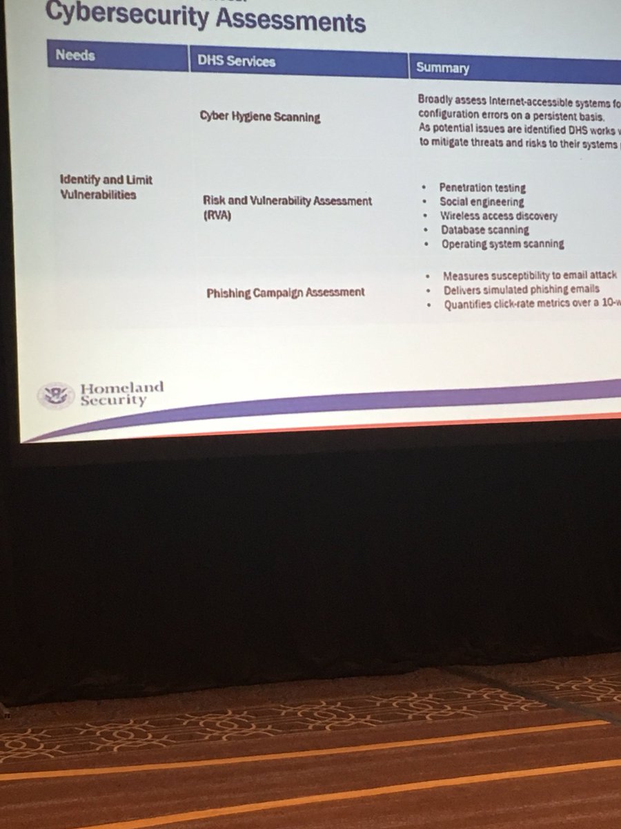 DHS- cyber security assessments available from DHS- Cyber Hygiene Scanning, Risk and Vulnerability Assessment and Phishing Campaign Assessment.pic.twitter.com/XP7KtaT46n