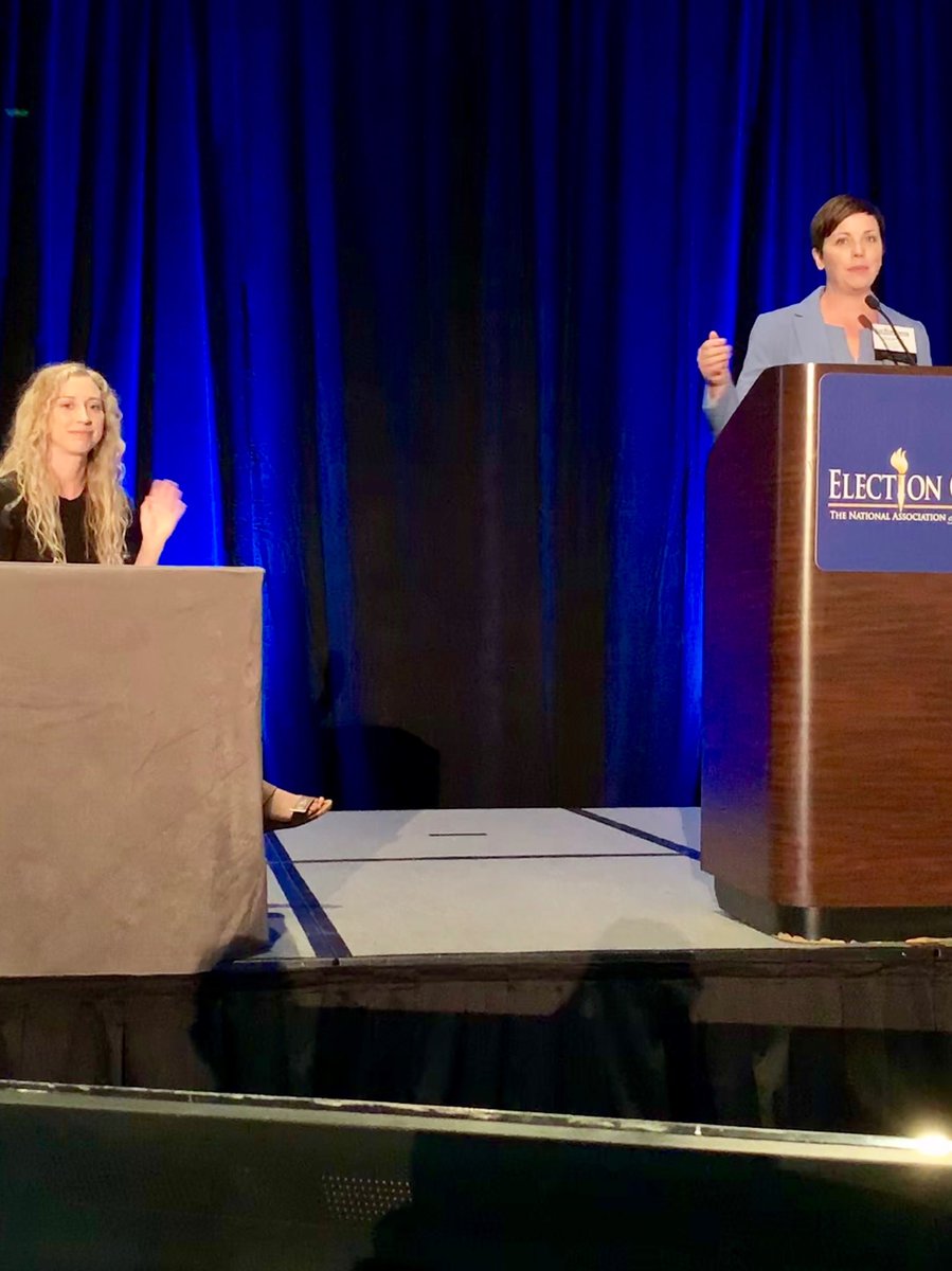 The winners of the Democracy Award are Jocelyn Bucaro and Shelby Miller of the Denver Election Division for their work on enhanced security and access for UOCAVA voters! Congratulations!pic.twitter.com/0U6rhNYVae