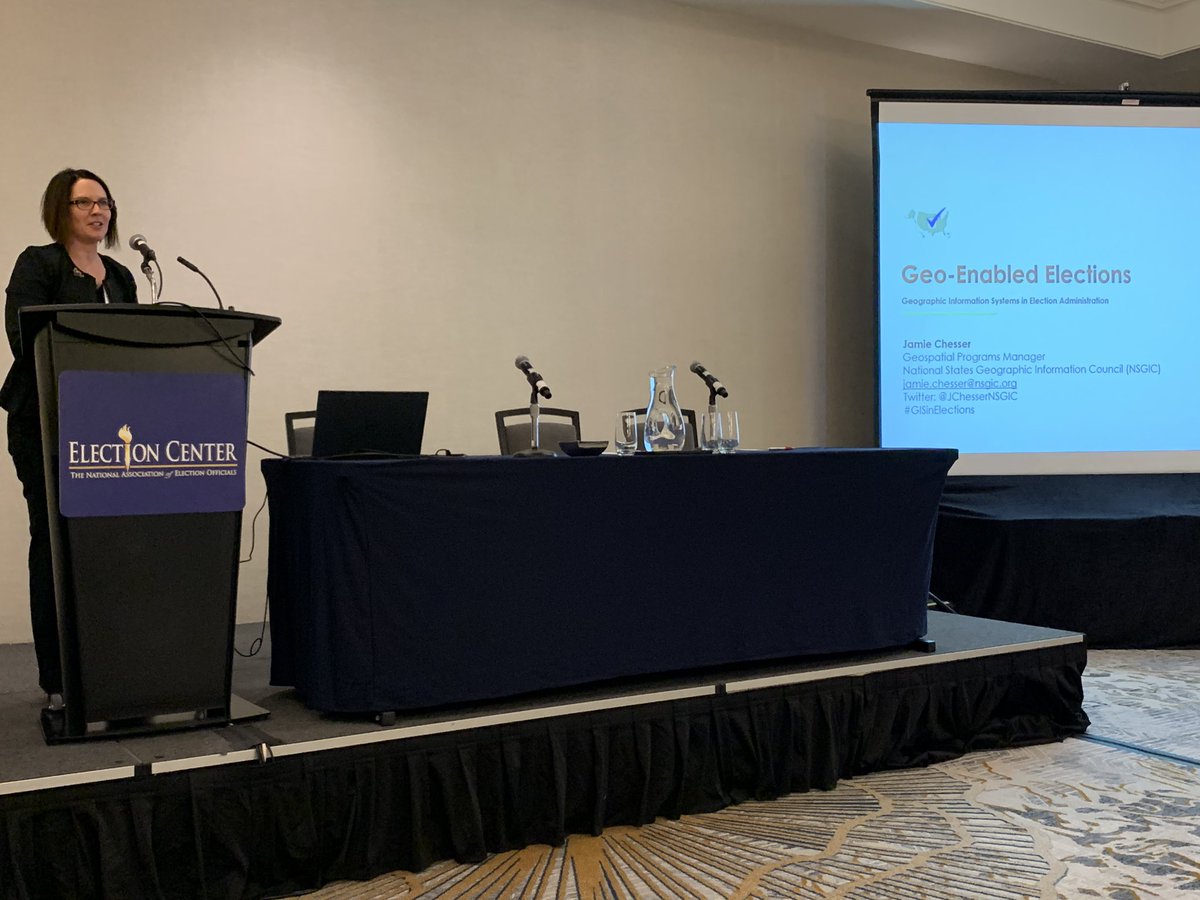 Next up we have Jamie Chesser, Geospatial Program Manager from the National States Geographic Information Council (NSGIC) presenting on their current work on using GIS systems in Election Administrationpic.twitter.com/IkIZRdhOds