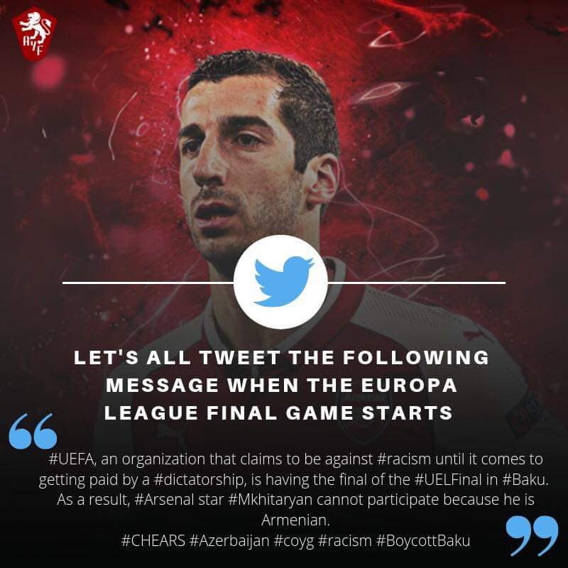 #UEFA, an organization that claims to be against#racism until it comes to getting paid by a#dictatorship, is holding the#UELFinal in#Baku. As a result#Arsenal star#Mkhitaryan cannot participate because he is#Armenian.#CHEARS#Azerbaijan#coyg#racism#BoycottBakupic.twitter.com/TMagSg3V1f