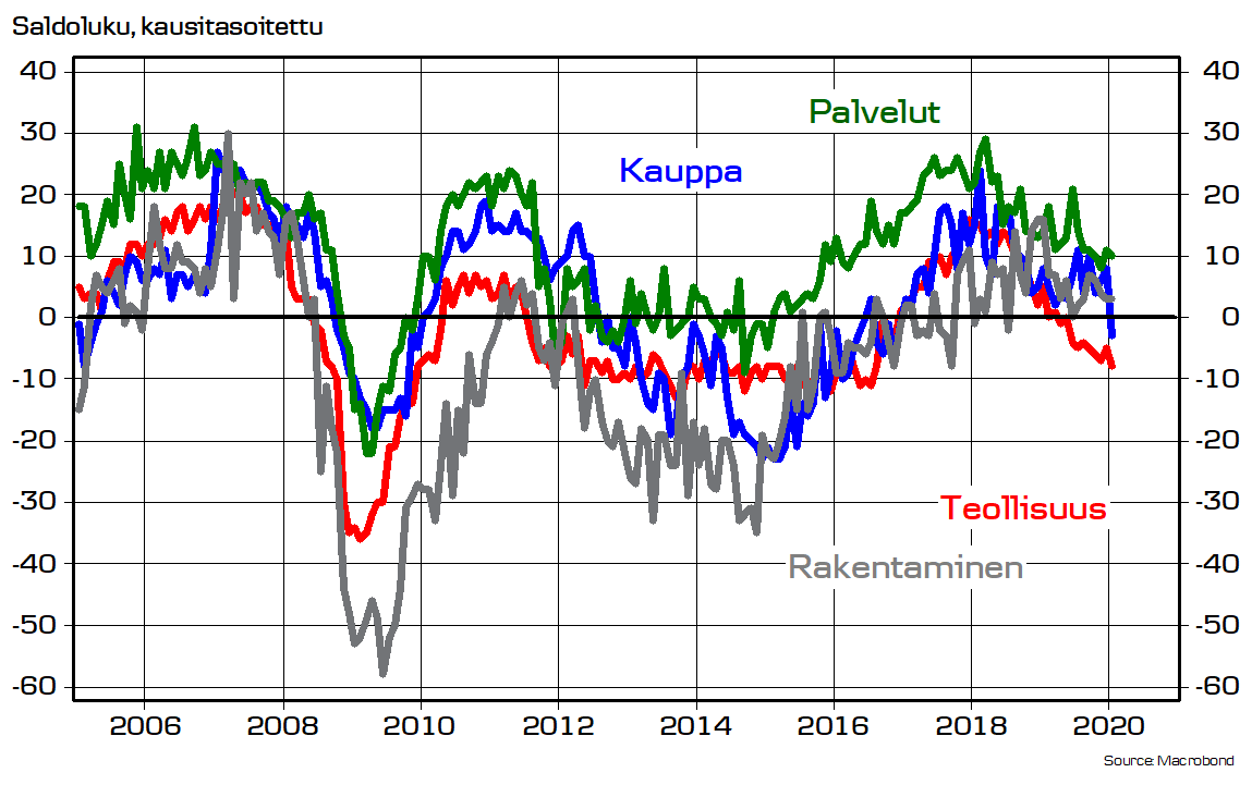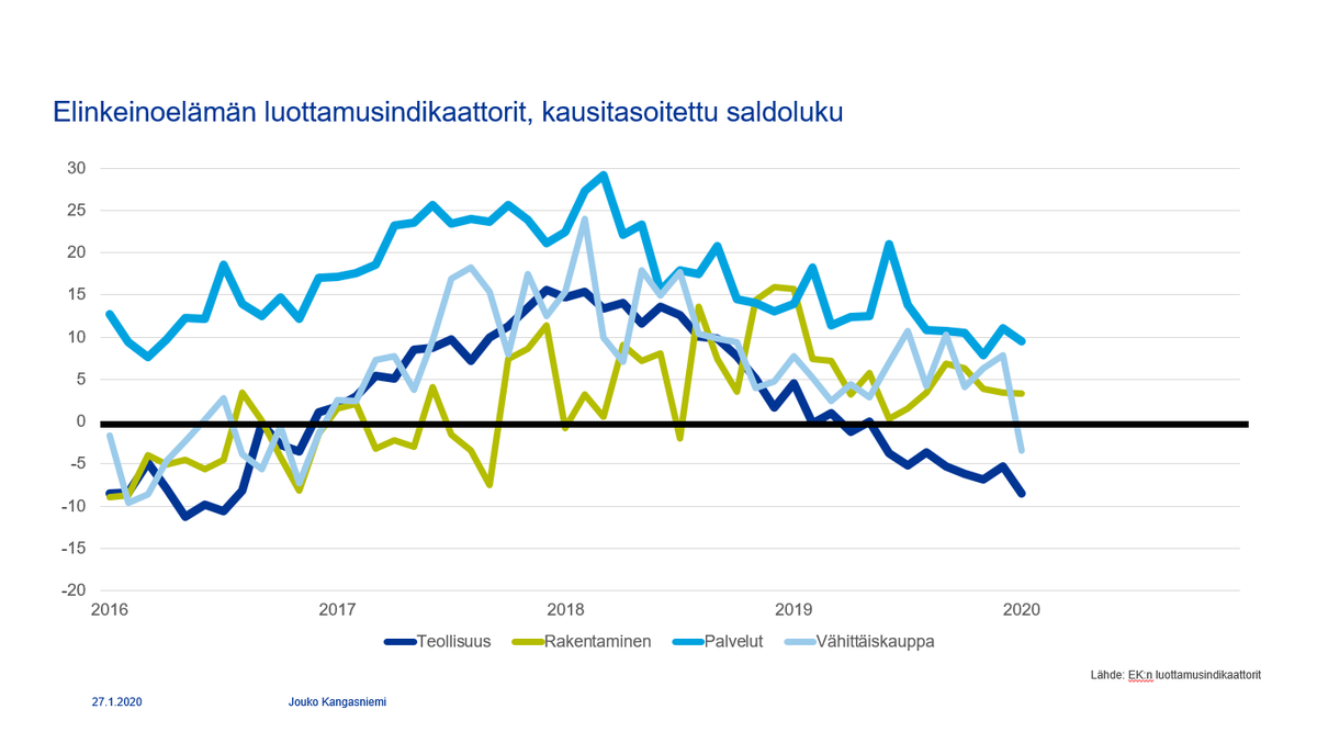 Kuluttajan fiilikset vakaat http://www.tilastokeskus.fi/til/kbar/2020/01/kbar_2020_01_2020-01-27_tie_001_fi.html … , mutta teollisuus ja kauppa synkistelevät vuoden alkajaisiksi https://ek.fi/ajankohtaista/tiedotteet/2020/01/27/elinkeinoelaman-luottamus-laski-tammikuussa/ … Kauas nousukausi karkaa.pic.twitter.com/76YGjYGN2E
