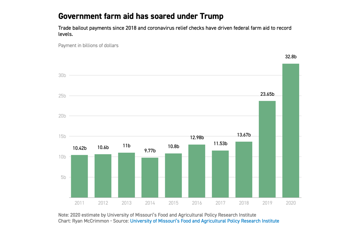 What results??? Farm economy has only suffered under Trump leadership. Tariffs on China caused China to stop buying US goods. US taxpayers paid for the farm bailouts, not China. Most bailout $$ went to big corp farms. Thus small farm bankruptcies have been up. Now COVID.