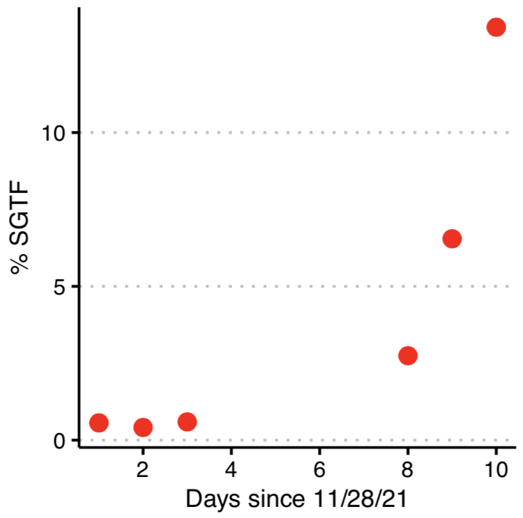 @UWVirology, we continue to screen positive specimens using SGTF. Confirmation by sequencing usually lags by a few days, but we expect the majority of these SGTFs to be Omicron. If so, definitely seeing a rapid rise similar to reports from South Africa, UK, Denmark, etc. https://twitter.com/pavitrarc/status/1467310081939177476 …pic.twitter.com/1d7Rheqoe6