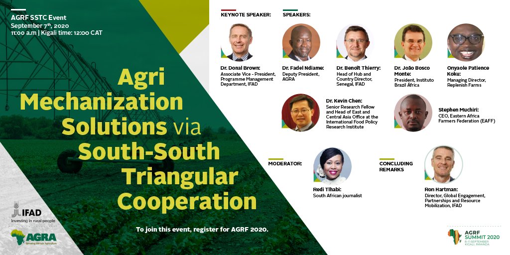 #AGRF2020 | Tune in today at 11 am CAT@AGRAAlliance & IFAD will host a webinar during the AGRF Virtual Summit on Agri Mechanization under South-South Triangular Cooperation.#FeedTheCitiespic.twitter.com/2kmXUf2MEM