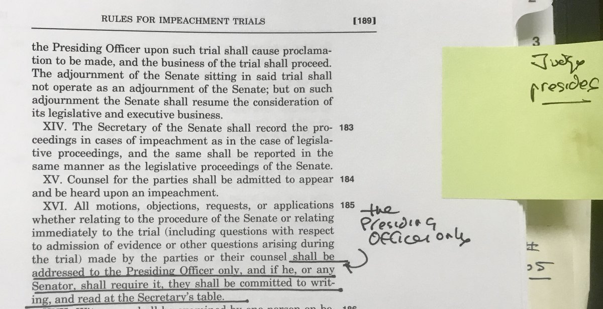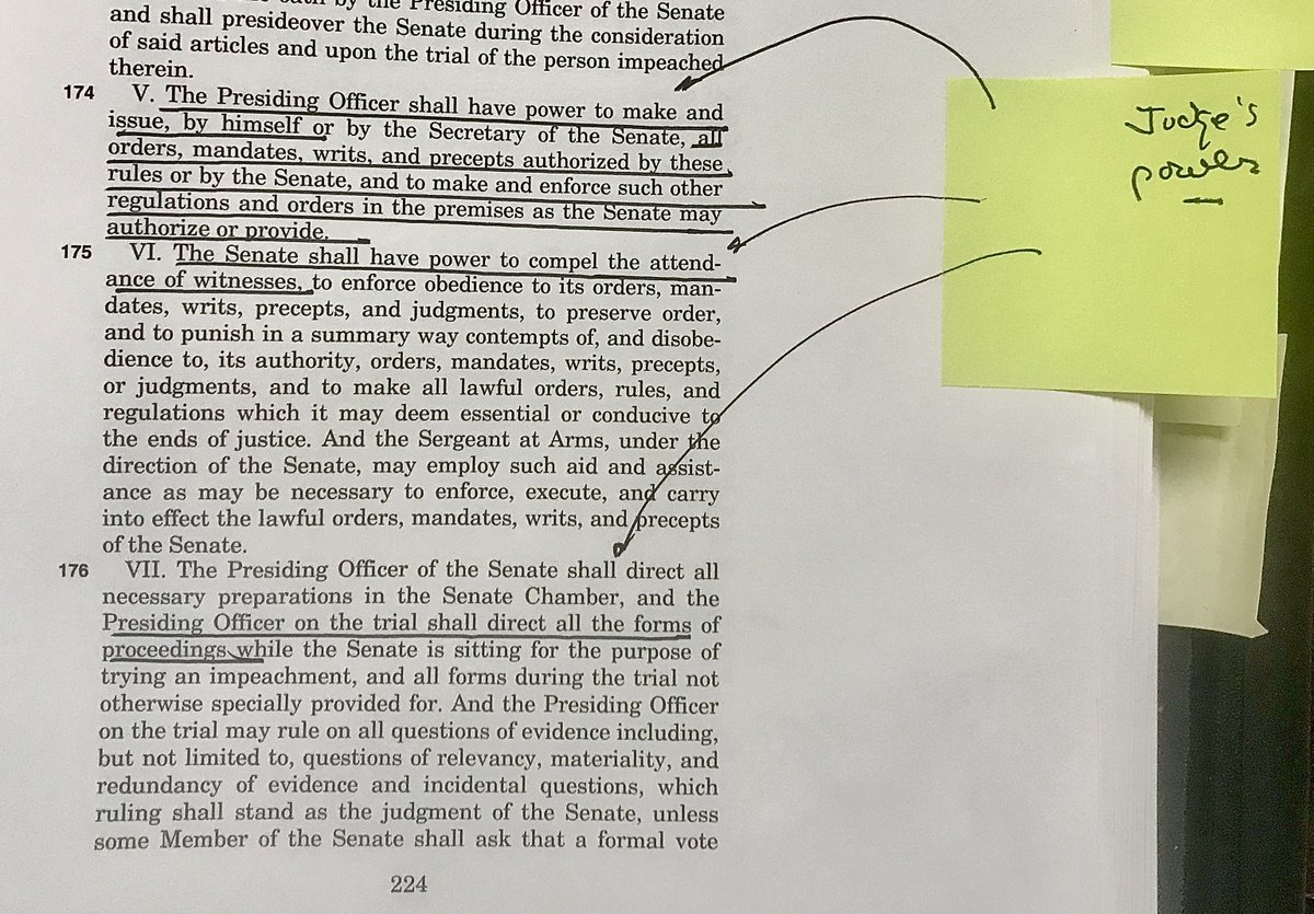 JUSTICE ROBERTS - as the “presiding officer” - can authorize subpoenas and do this on his own, no appeals by the Senators, as their jurisdictional competence applies only to evidential matters - not to calling witnesses (or not). These are the key sections that say so.pic.twitter.com/OGX5ikIVe8