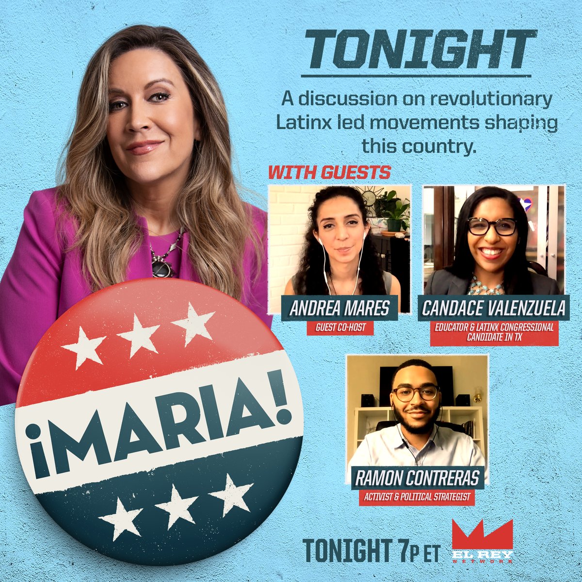TONIGHT on ¡MARIA! @MariaTCardona & guest co-host @andrea7mares discuss revolutionary #Latinx led movements shaping this country. Joining are guests @candacefor24 & @_RamonContreras!