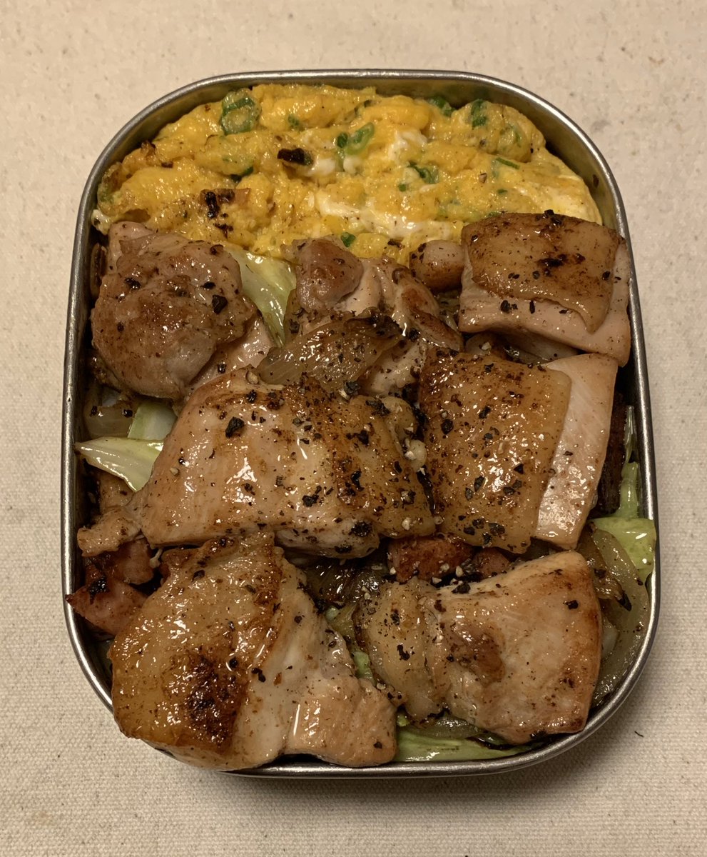 本日の弁当は、鶏もも肉とキャベツ、タマネギ、ベーコンの炒め物になりましたよ。味付けは最近ハマってる塩胡椒で ( ´ ▽ ` )ノpic.twitter.com/fs4m4I4Vbm